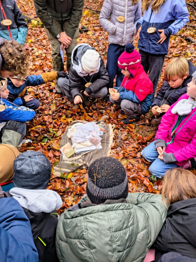 Beim ersten Spiel haben sie uns in Eichhörnchen verwandelt. Wir bekamen jeder 10 Eicheln, die wir versteckt haben. Danach mussten wir sie wieder finden – wie die Eichhörnchen im Winter.